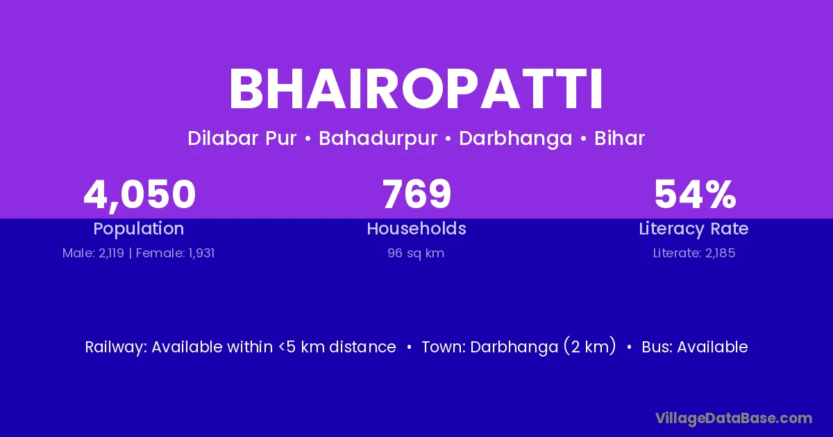 Dalsinghsarai (10 km) is the nearest town to Bhairopatti village for major economic activities and is located approximately 10 km away.