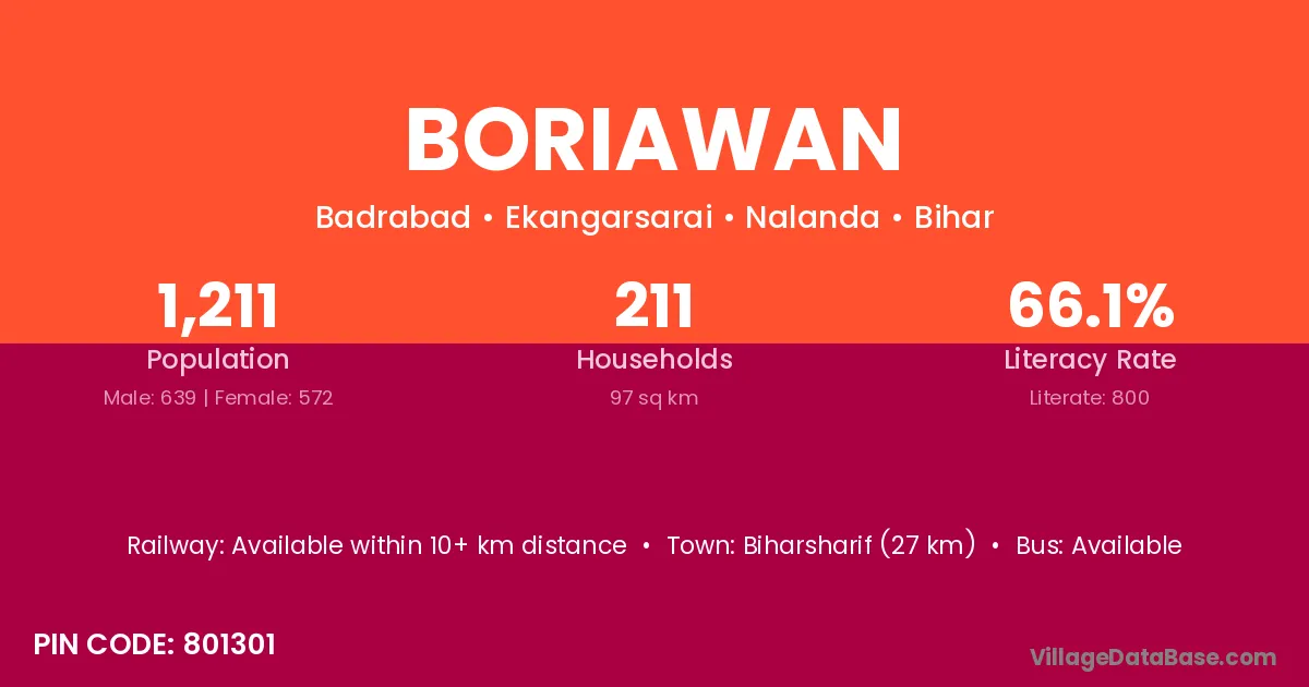 Dalsinghsarai (6 km) is the nearest town to Boriawan village for major economic activities and is located approximately 6 km away.