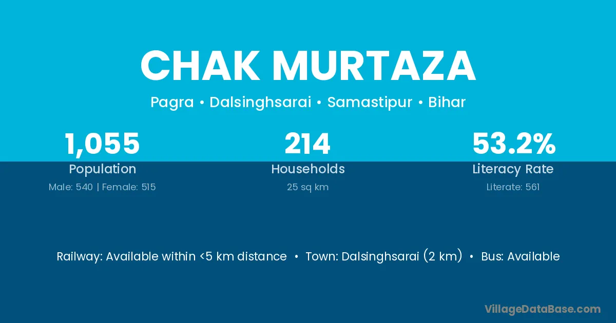 Dalsinghsarai (2 km) is the nearest town to Chak Murtaza village for major economic activities and is located approximately 2 km away.