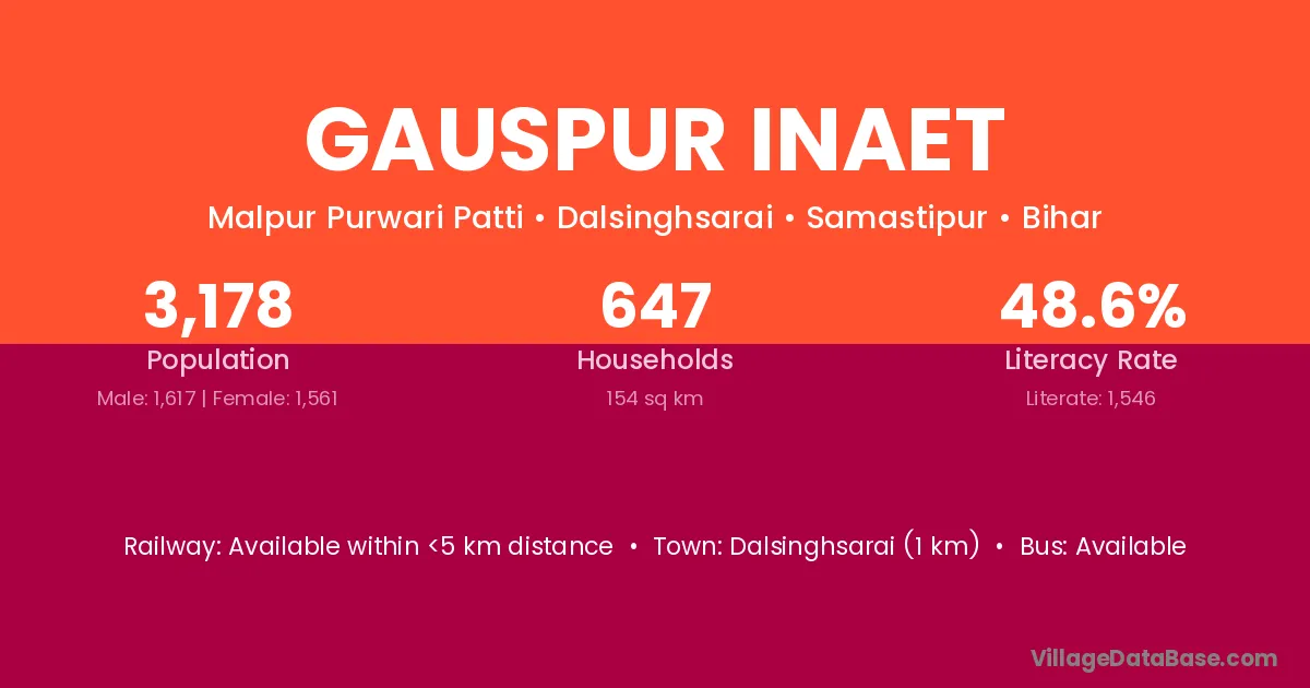Dalsinghsarai (1 km) is the nearest town to Gauspur Inaet village for major economic activities and is located approximately 1 km away.