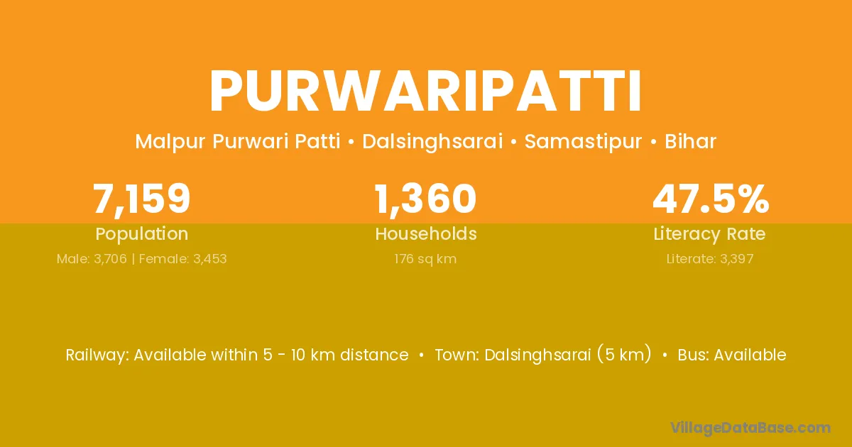 Dalsinghsarai (5 km) is the nearest town to Purwaripatti village for major economic activities and is located approximately 5 km away.