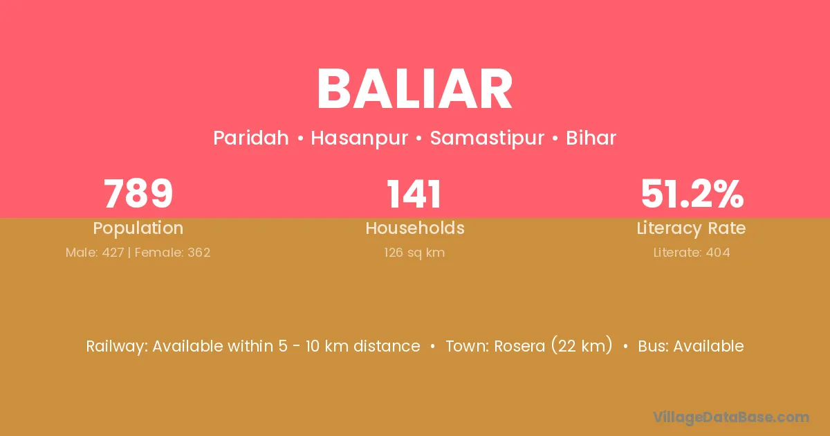 Rosera (22 km) is the nearest town to Baliar village for major economic activities and is located approximately 22 km away.