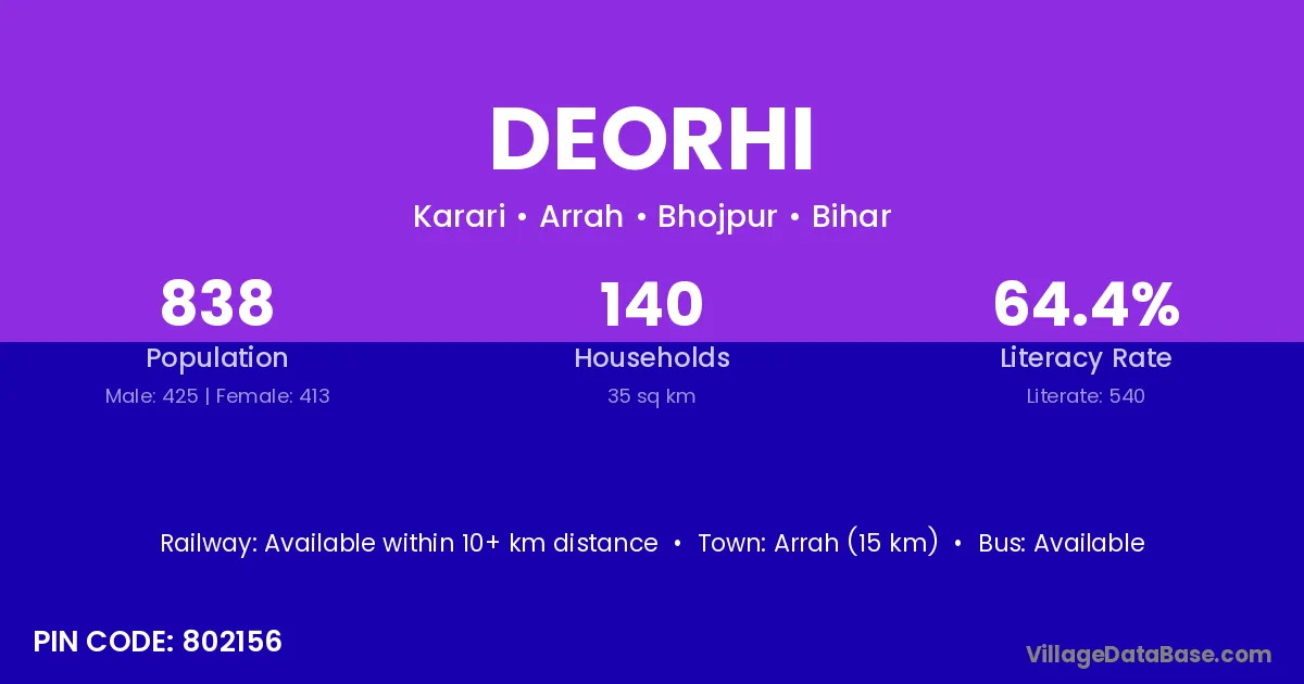 Rosera (20 km) is the nearest town to Deorhi village for major economic activities and is located approximately 20 km away.