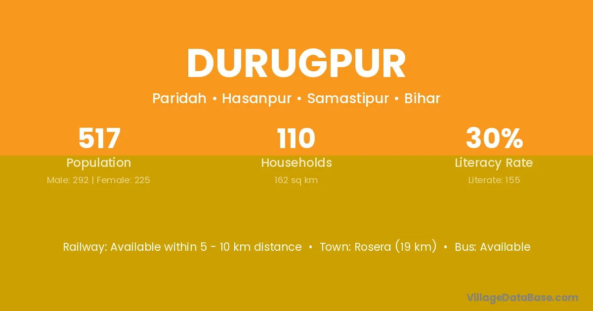 Rosera (19 km) is the nearest town to Durugpur village for major economic activities and is located approximately 19 km away.