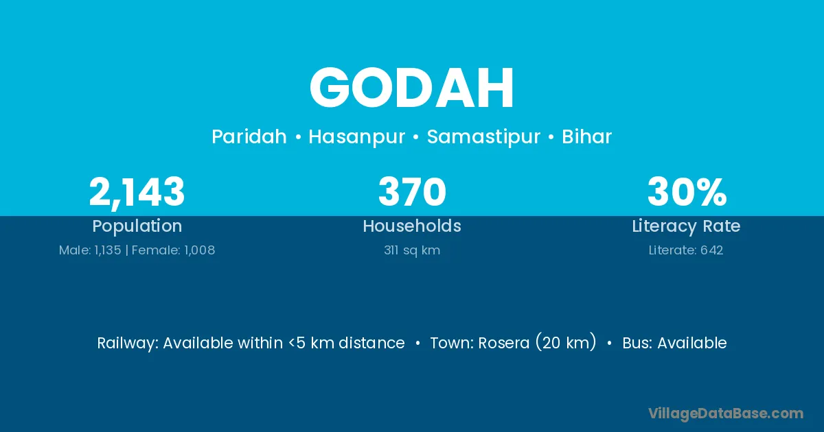 Rosera (20 km) is the nearest town to Godah village for major economic activities and is located approximately 20 km away.