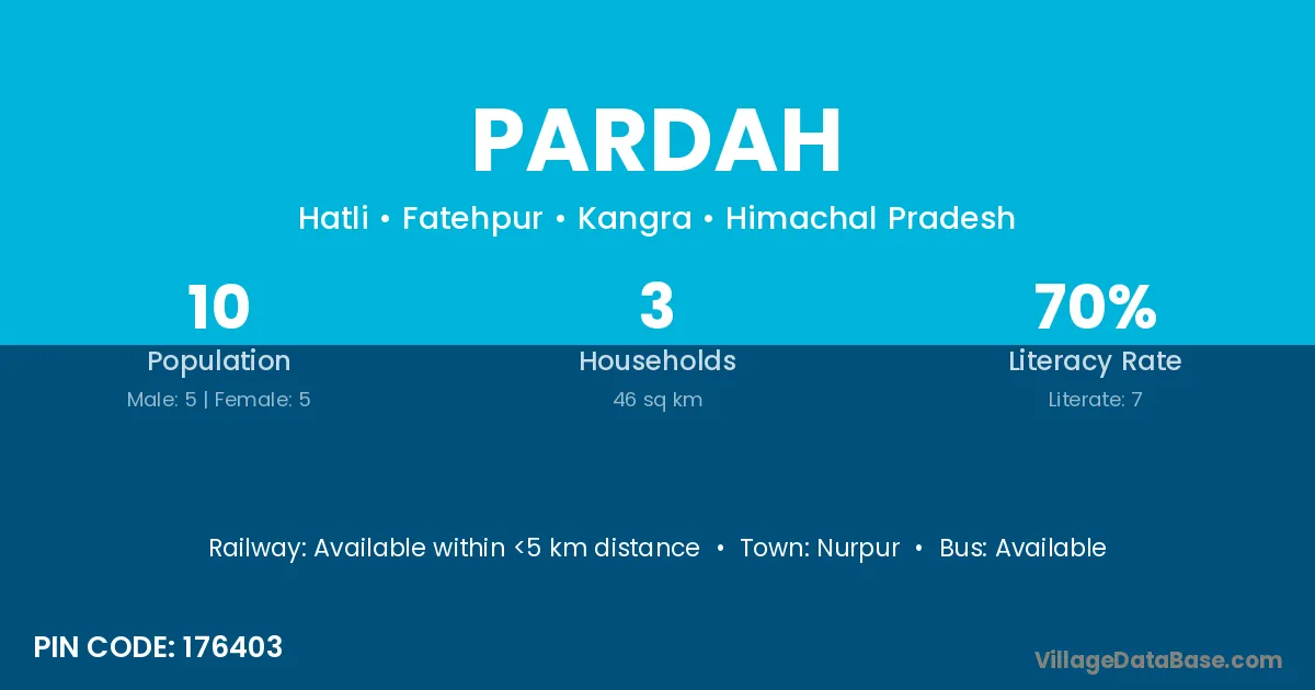 The literacy rate of Pardah village is 41.72%. Male literacy stands at 50.94% and female literacy at 31.42%.