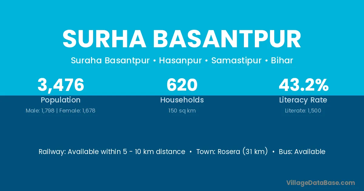 Rosera (31 km) is the nearest town to Surha Basantpur village for major economic activities and is located approximately 31 km away.