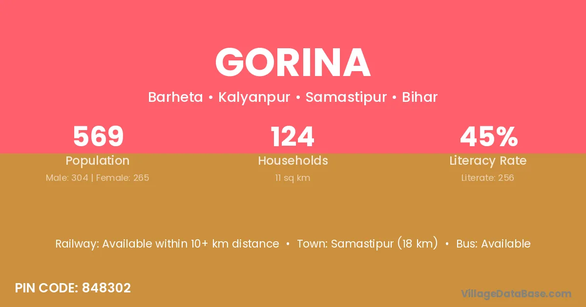 Samastipur (18 km) is the nearest town to Gorina village for major economic activities and is located approximately 18 km away.