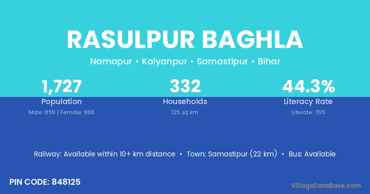 Samastipur (22 km) is the nearest town to Rasulpur Baghla village for major economic activities and is located approximately 22 km away.
