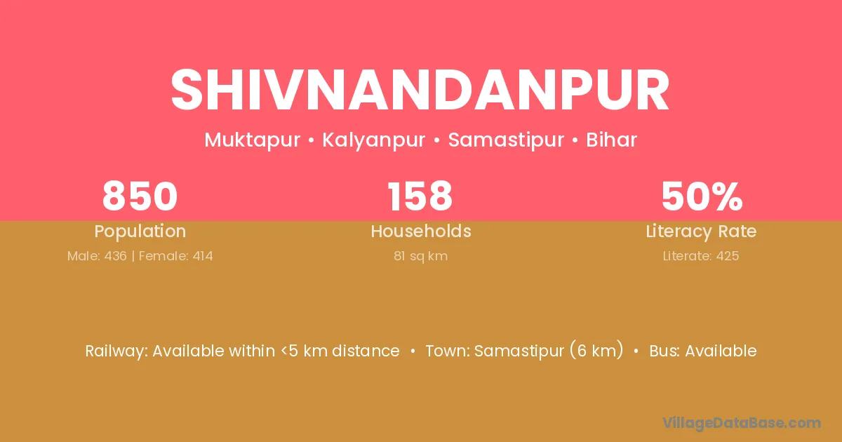 Samastipur (6 km) is the nearest town to Shivnandanpur village for major economic activities and is located approximately 6 km away.