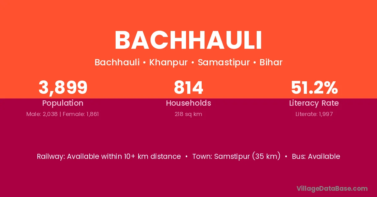 Samstipur (35 km) is the nearest town to Bachhauli village for major economic activities and is located approximately 35 km away.