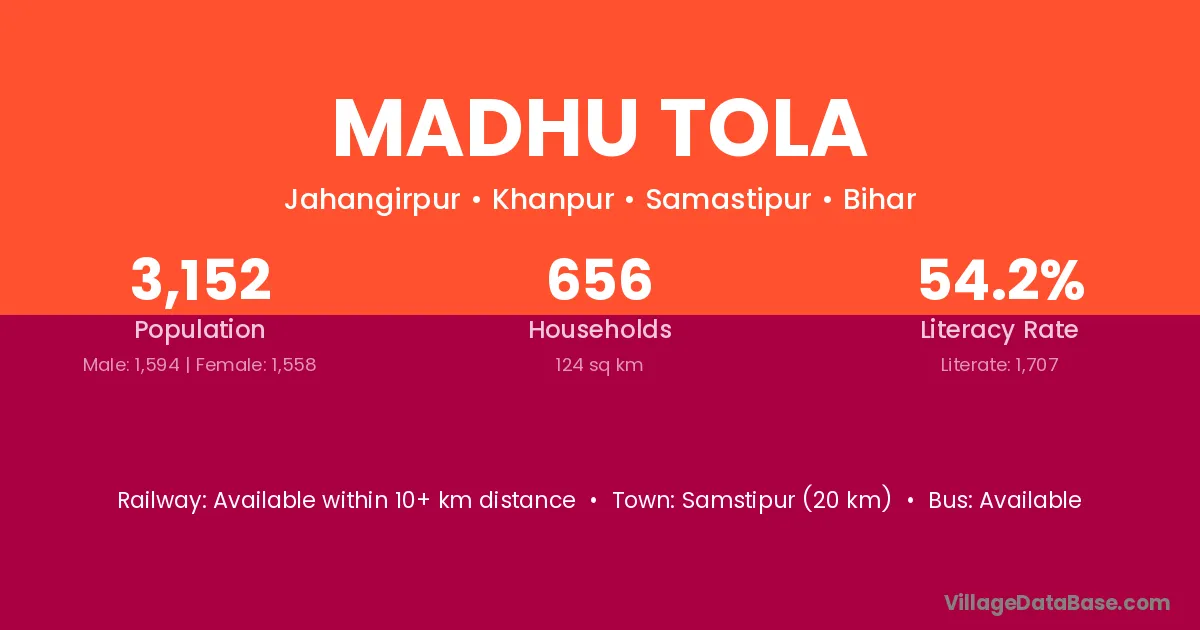 Samstipur (20 km) is the nearest town to Madhu Tola village for major economic activities and is located approximately 20 km away.