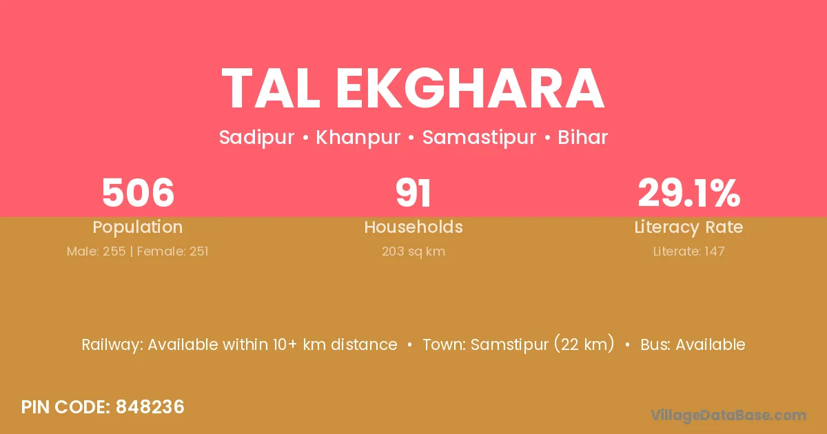 Samstipur (22 km) is the nearest town to Tal Ekghara village for major economic activities and is located approximately 22 km away.