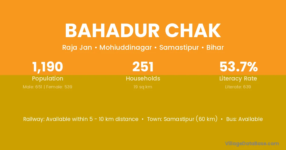 Samastipur (60 km) is the nearest town to Bahadur Chak village for major economic activities and is located approximately 60 km away.