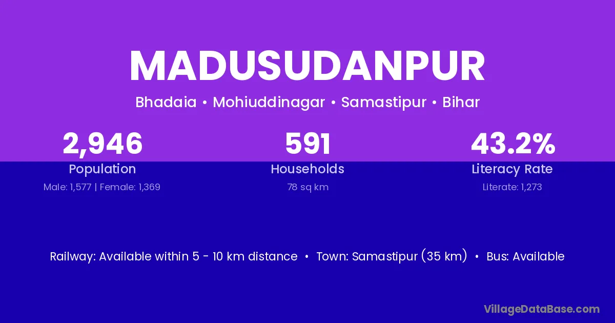 Samastipur (35 km) is the nearest town to Madusudanpur village for major economic activities and is located approximately 35 km away.