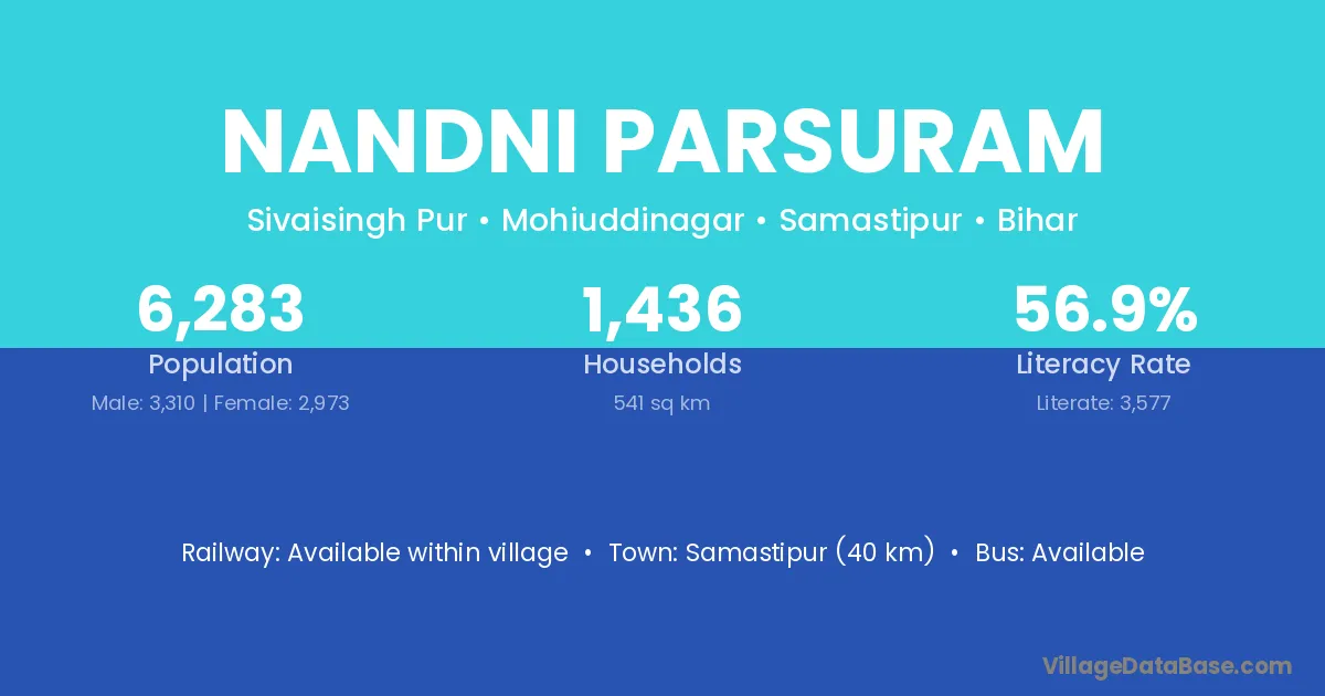 Samastipur (40 km) is the nearest town to Nandni Parsuram village for major economic activities and is located approximately 40 km away.