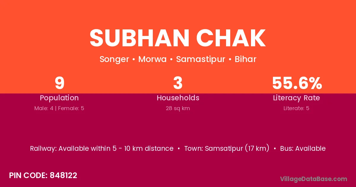 Samsatipur (17 km) is the nearest town to Subhan Chak village for major economic activities and is located approximately 17 km away.