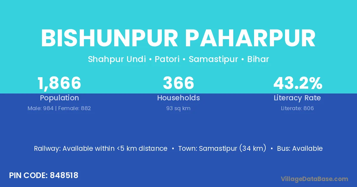 Samastipur (34 km) is the nearest town to Bishunpur Paharpur village for major economic activities and is located approximately 34 km away.
