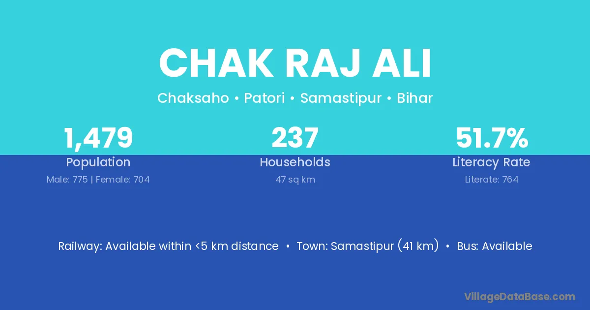 Samastipur (41 km) is the nearest town to Chak Raj Ali village for major economic activities and is located approximately 41 km away.