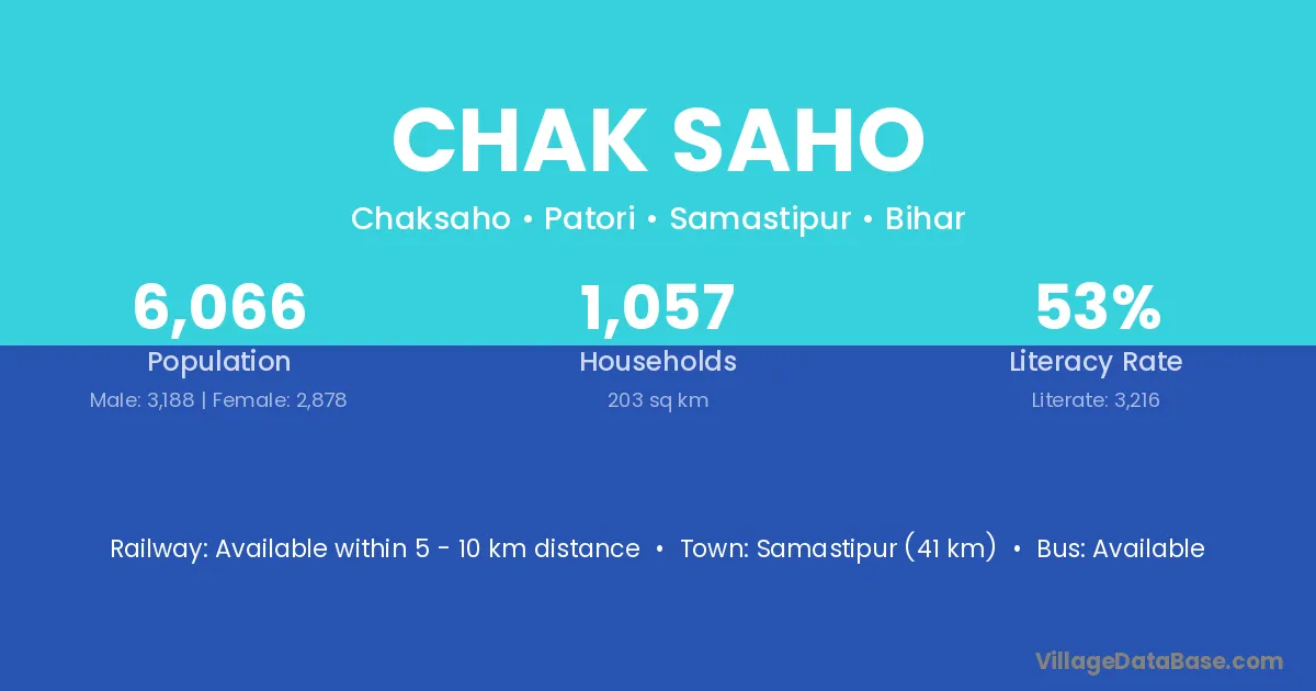 Samastipur (41 km) is the nearest town to Chak Saho village for major economic activities and is located approximately 41 km away.