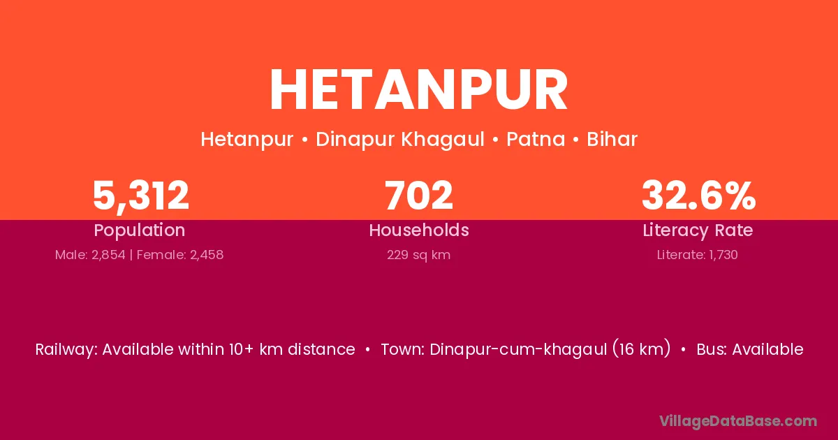 Samastripur (40 km) is the nearest town to Hetanpur village for major economic activities and is located approximately 40 km away.