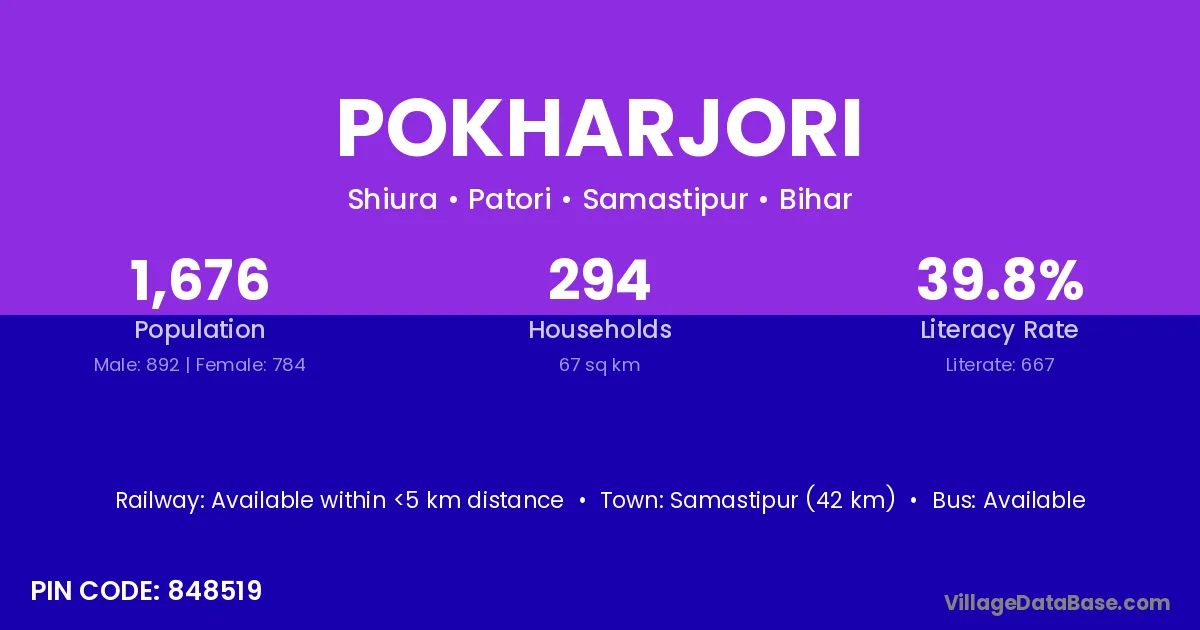 Samastipur (42 km) is the nearest town to Pokharjori village for major economic activities and is located approximately 42 km away.