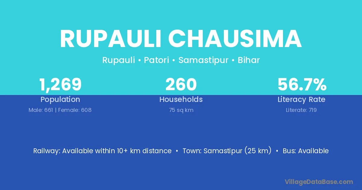 Samastipur (25 km) is the nearest town to Rupauli Chausima village for major economic activities and is located approximately 25 km away.