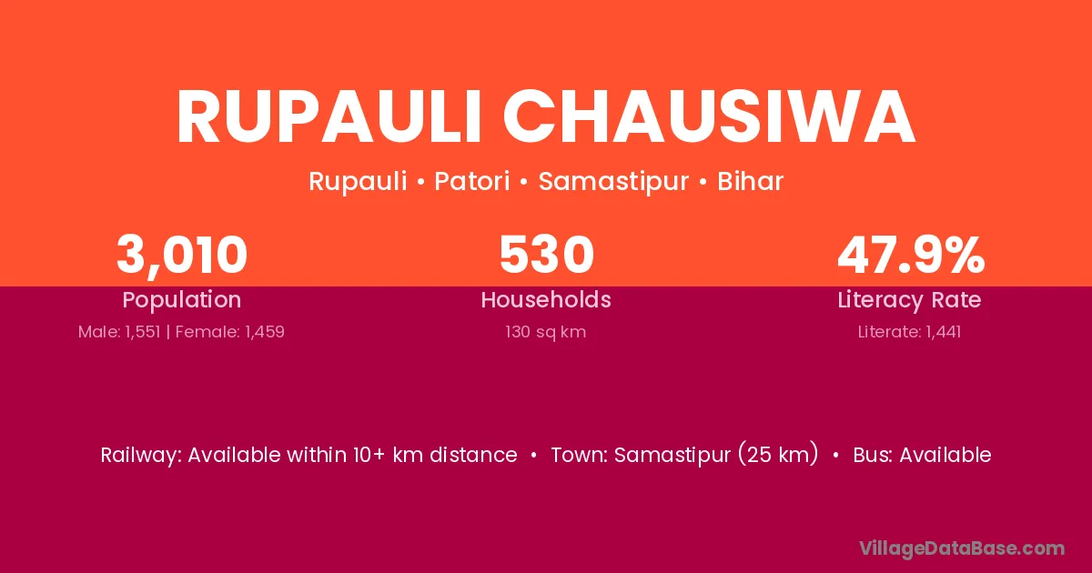 Samastipur (25 km) is the nearest town to Rupauli Chausiwa village for major economic activities and is located approximately 25 km away.
