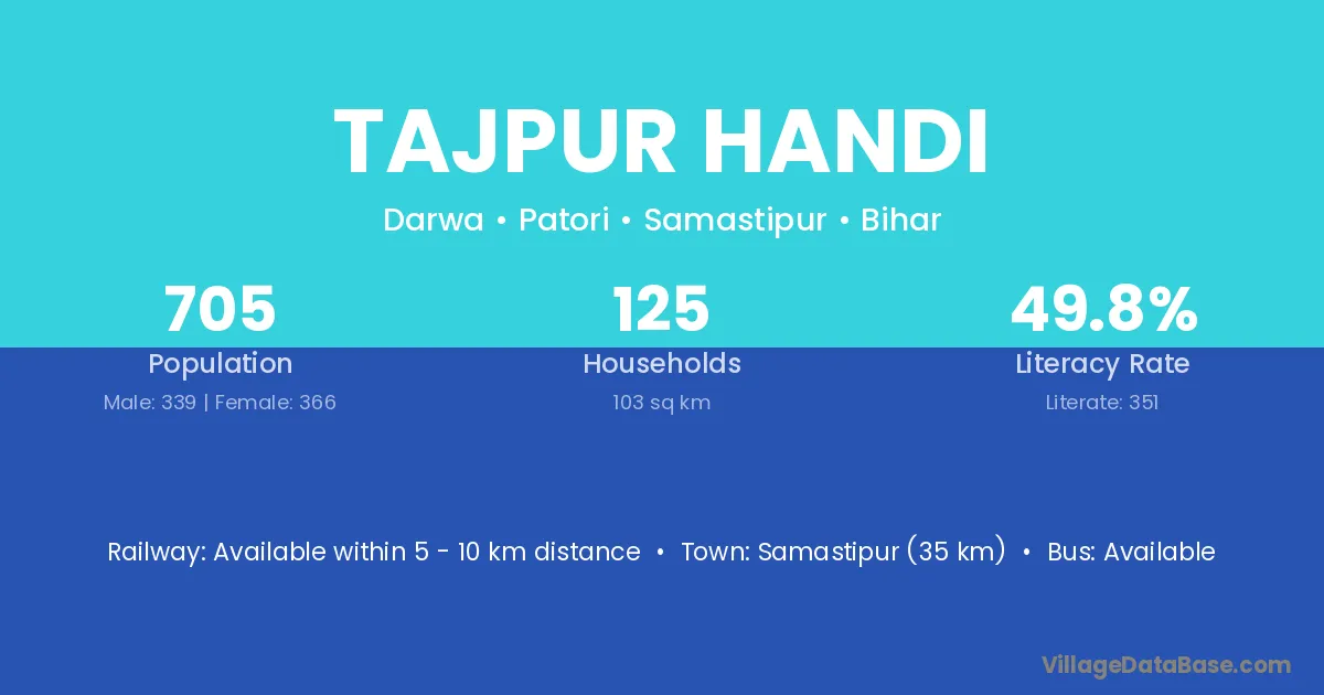 Samastipur (35 km) is the nearest town to Tajpur Handi village for major economic activities and is located approximately 35 km away.
