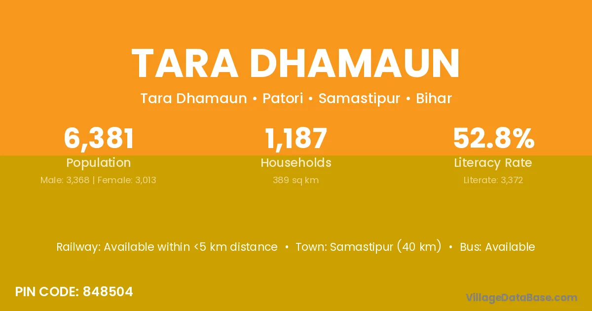 Samastipur (40 km) is the nearest town to Tara Dhamaun village for major economic activities and is located approximately 40 km away.