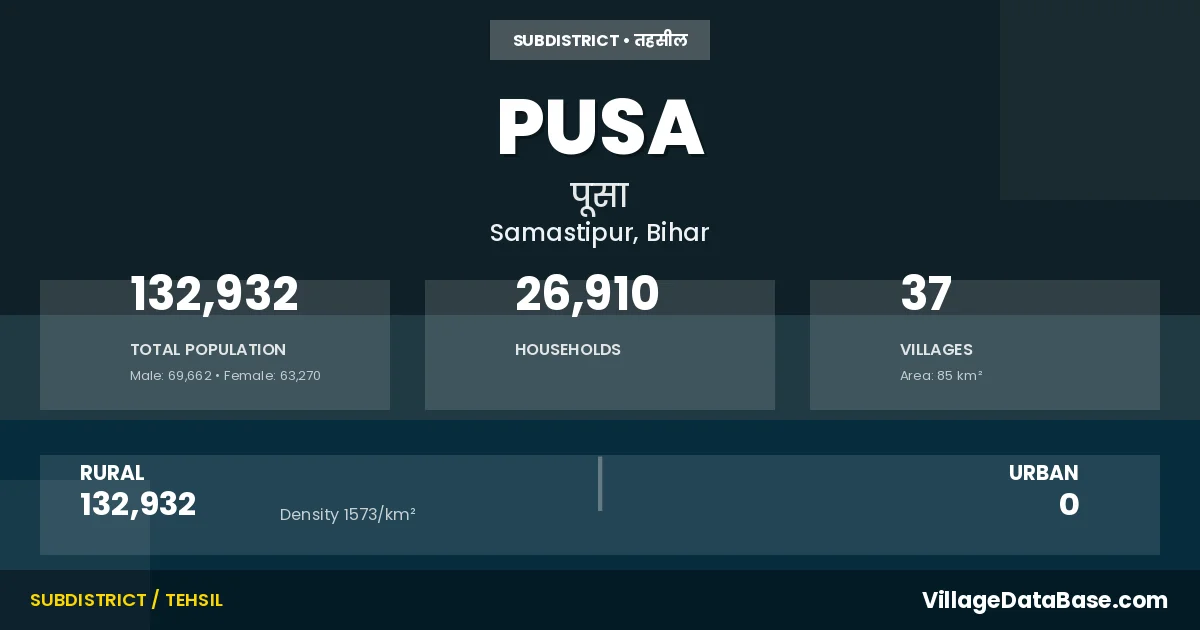 According to the 2011 census The total area of Pusa Subdivision is 85 km², with a population of 132932 people. The population density is 1,573 inhabitants per square kilometre, and there are approximately 26910 houses in the sub district.