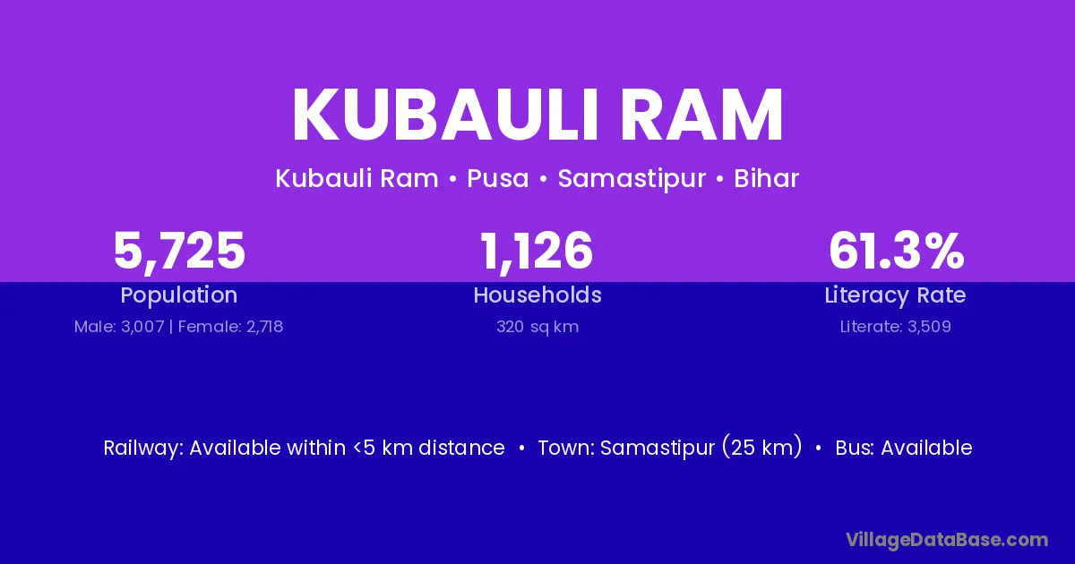 Samastipur (25 km) is the nearest town to Kubauli Ram village for major economic activities and is located approximately 25 km away.