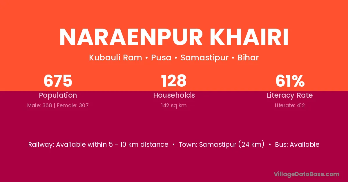 Samastipur (24 km) is the nearest town to Naraenpur Khairi village for major economic activities and is located approximately 24 km away.