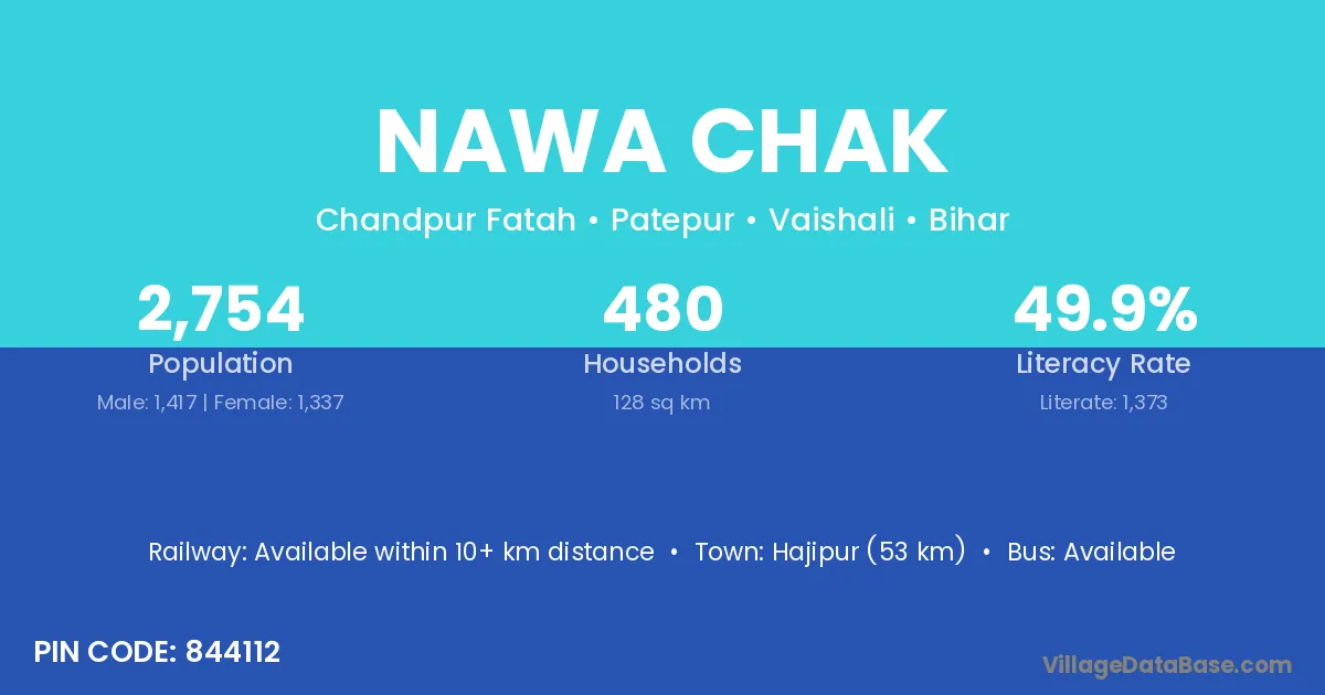 Samastipur (15 km) is the nearest town to Nawa Chak village for major economic activities and is located approximately 15 km away.
