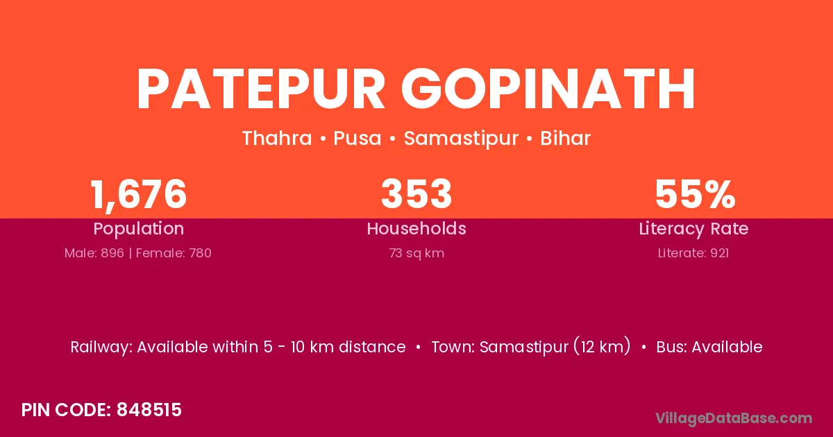 Samastipur (12 km) is the nearest town to Patepur Gopinath village for major economic activities and is located approximately 12 km away.
