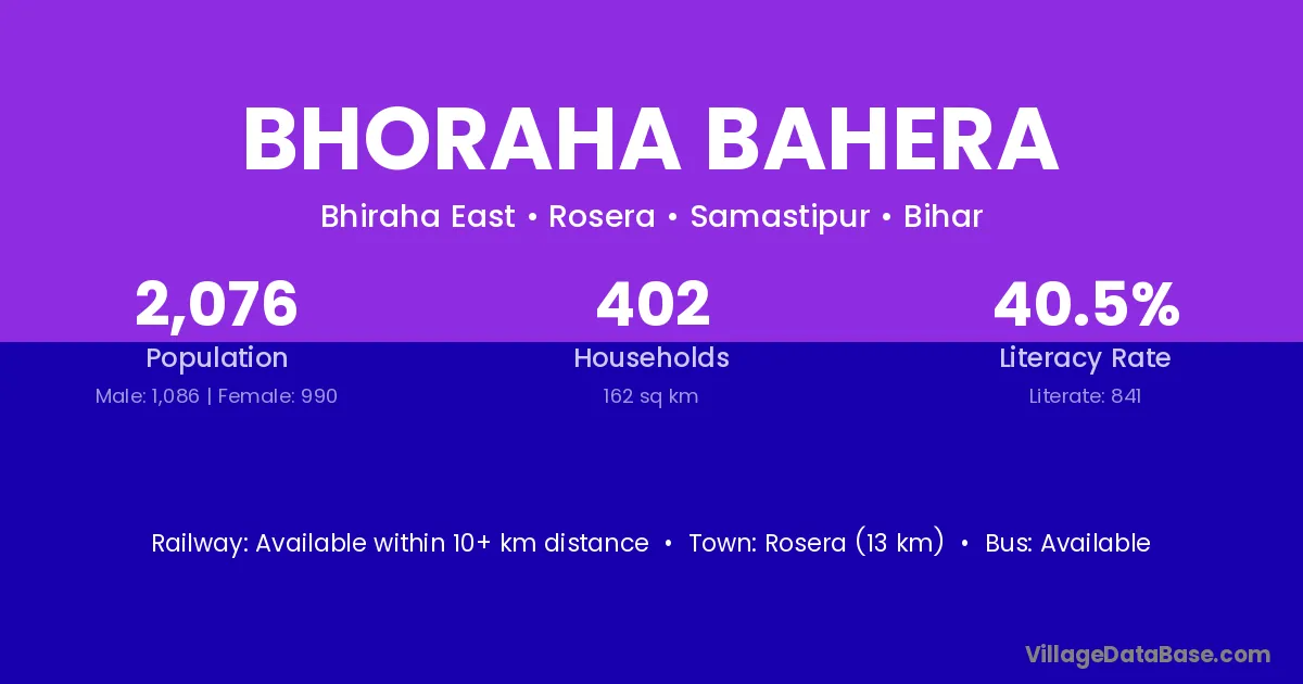 Rosera (13 km) is the nearest town to Bhoraha Bahera village for major economic activities and is located approximately 13 km away.