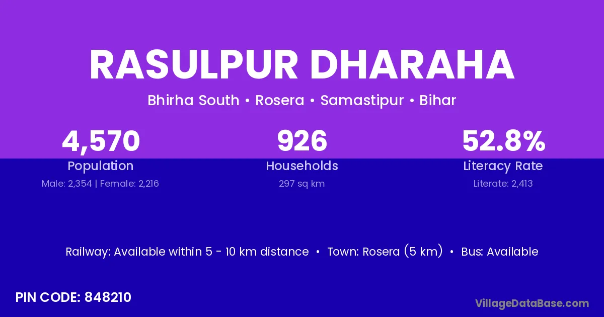 Rosera (5 km) is the nearest town to Rasulpur Dharaha village for major economic activities and is located approximately 5 km away.