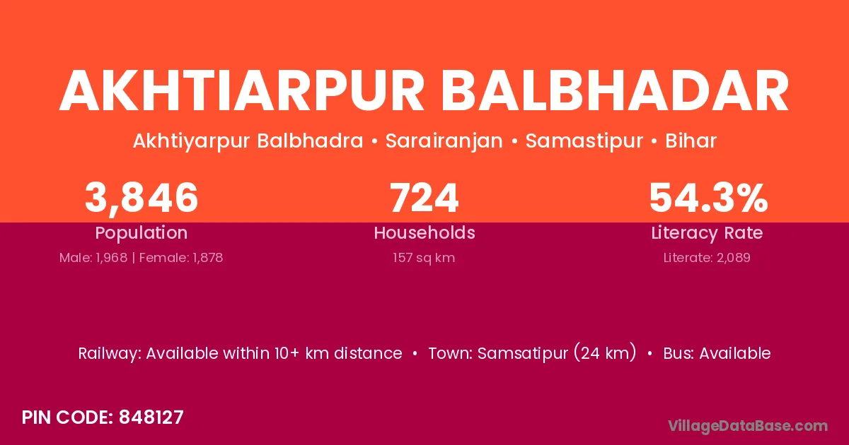 Samsatipur (24 km) is the nearest town to Akhtiarpur Balbhadar village for major economic activities and is located approximately 24 km away.