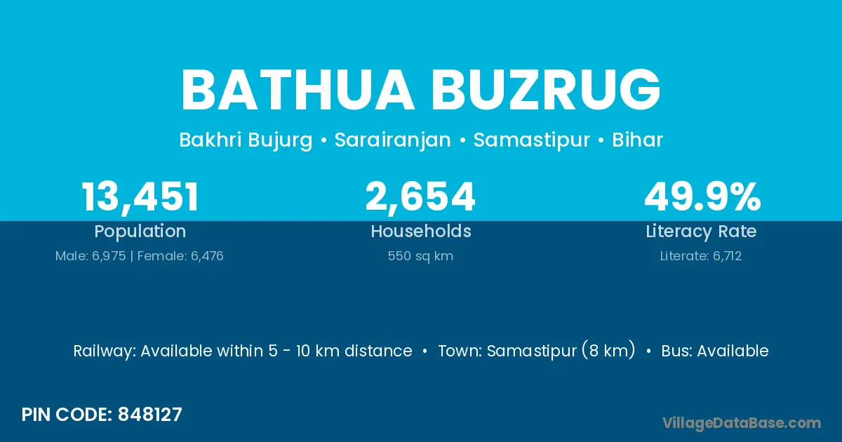 Samastipur (8 km) is the nearest town to Bathua Buzrug village for major economic activities and is located approximately 8 km away.