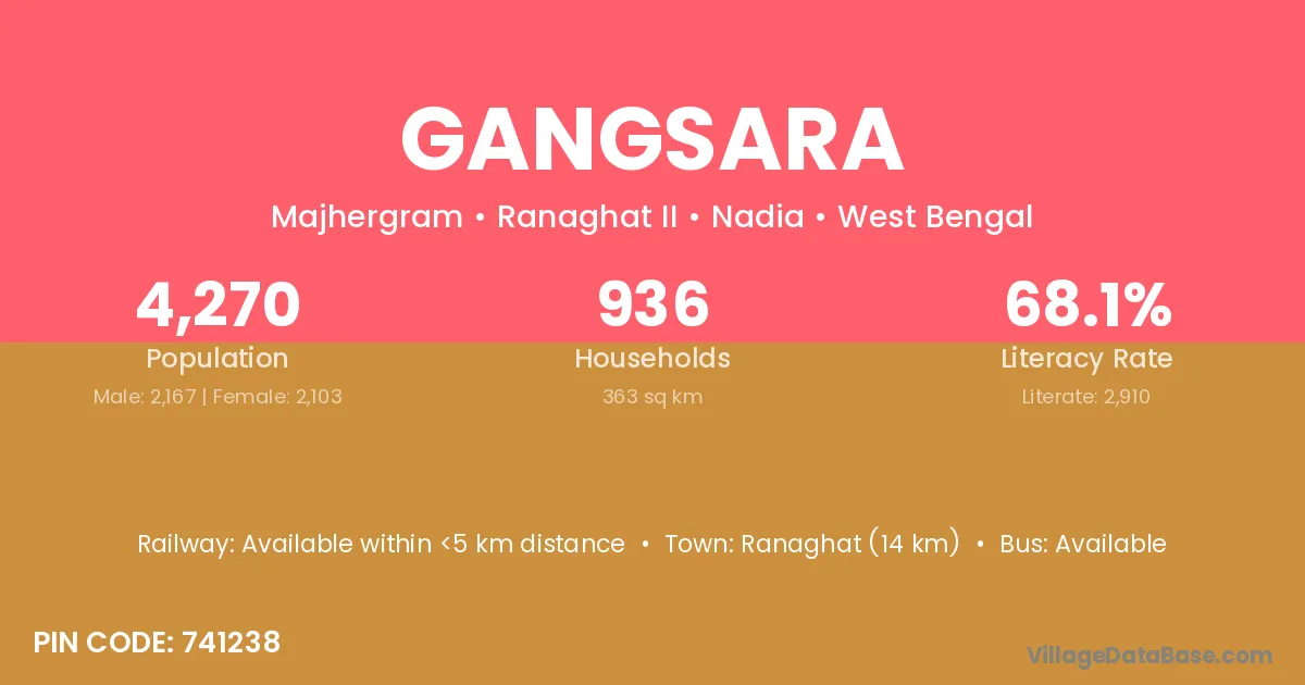 Gangsara village has a total population of 6,868 people, of which 3,508 are males and 3,360 are females.