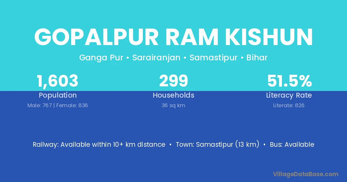 Samastipur (13 km) is the nearest town to Gopalpur Ram Kishun village for major economic activities and is located approximately 13 km away.