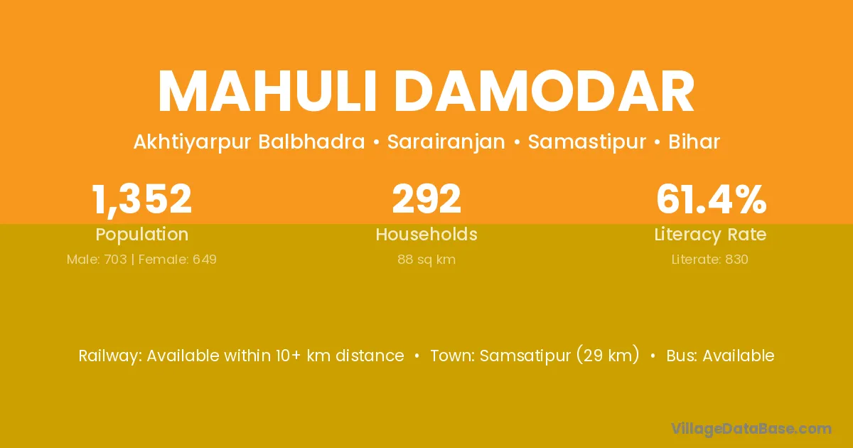 Samsatipur (29 km) is the nearest town to Mahuli Damodar village for major economic activities and is located approximately 29 km away.