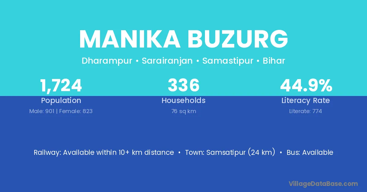 Samsatipur (24 km) is the nearest town to Manika Buzurg village for major economic activities and is located approximately 24 km away.