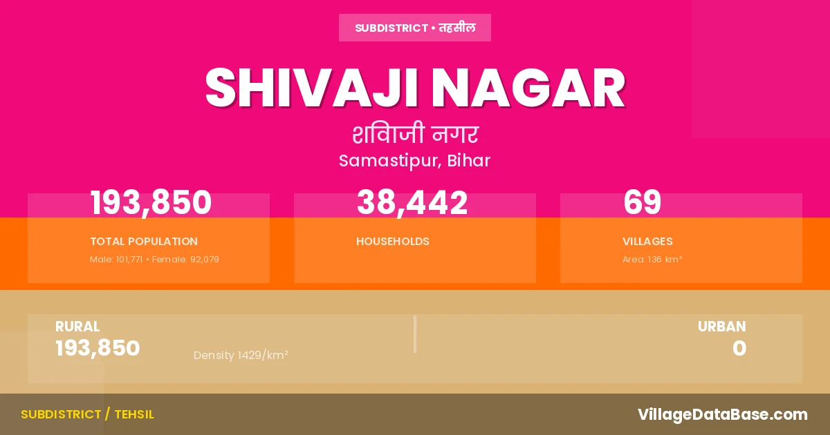 Shivaji Nagar is a town and Subdivision in the Samastipur district of the Bihar. In India, a Subdivision is a subdivision of a district responsible for the administration and revenue collection of a specific area within the district. Subdivisions play a crucial role in the local governance structure, contributing significantly to the development and administration of their communities.