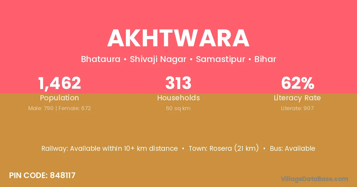 Akhtwara village has a total population of 1,462 people, of which 790 are males and 672 are females.