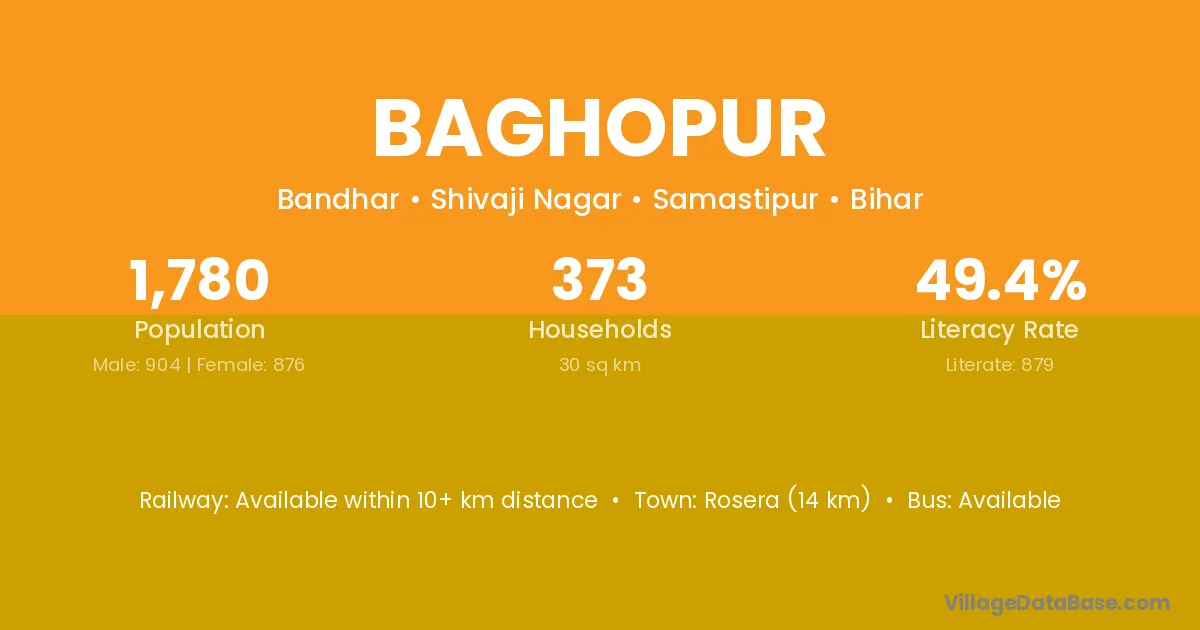 Rosera (14 km) is the nearest town to Baghopur village for major economic activities and is located approximately 14 km away.