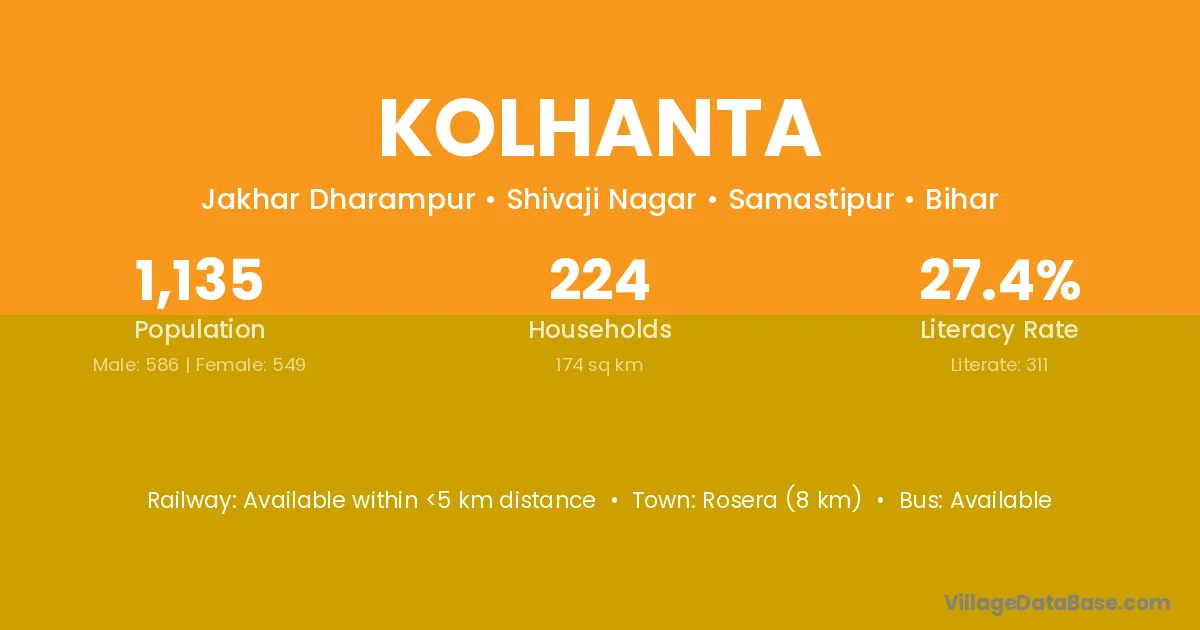 Rosera (8 km) is the nearest town to Kolhanta village for major economic activities and is located approximately 8 km away.
