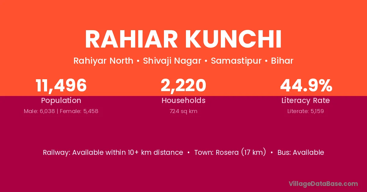 Rosera (17 km) is the nearest town to Rahiar Kunchi village for major economic activities and is located approximately 17 km away.