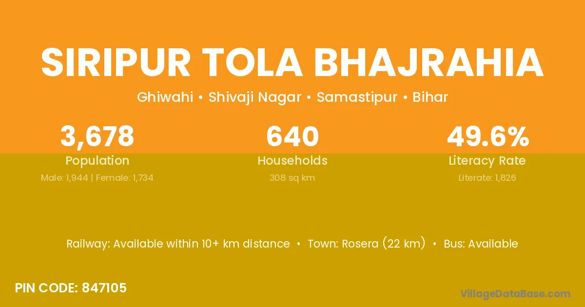 Rosera (22 km) is the nearest town to Siripur Tola Bhajrahia village for major economic activities and is located approximately 22 km away.