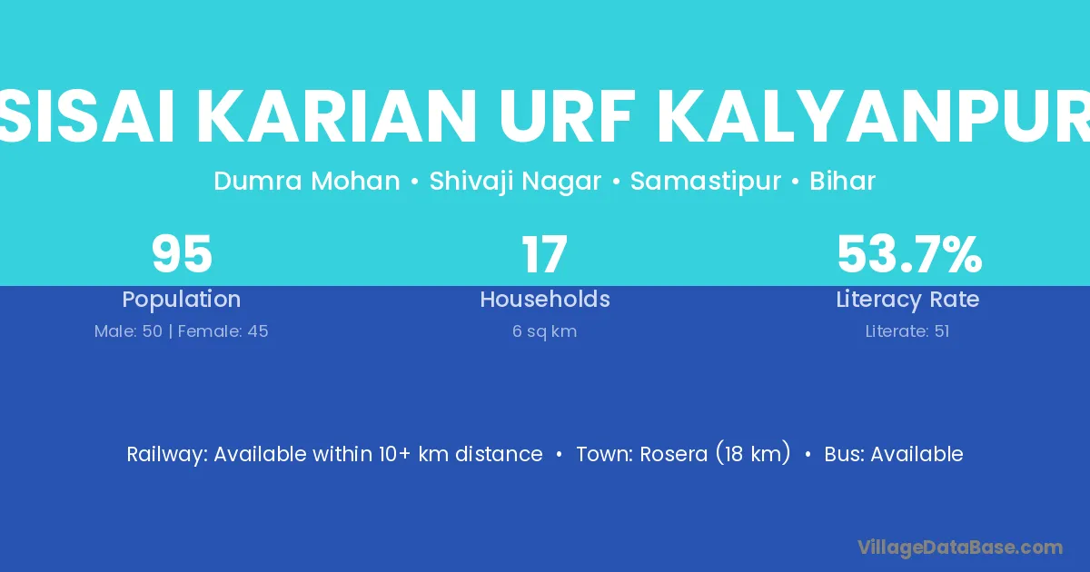 Rosera (18 km) is the nearest town to Sisai Karian Urf Kalyanpur village for major economic activities and is located approximately 18 km away.